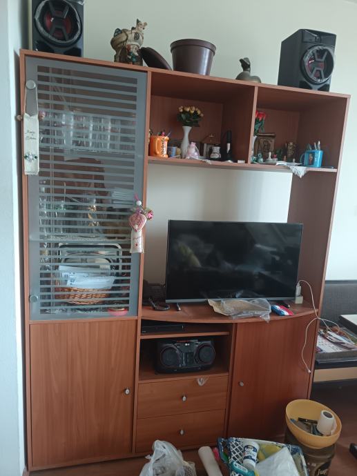 Prodajem rabljen smeđi uščuvan, ponegdje ogreban regal za tv s mjestom za odlaganje ispod tv-a i policama sa staklenim vratima. V 182 š 145 d 40. Nalazi se u Travnom.