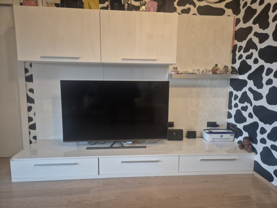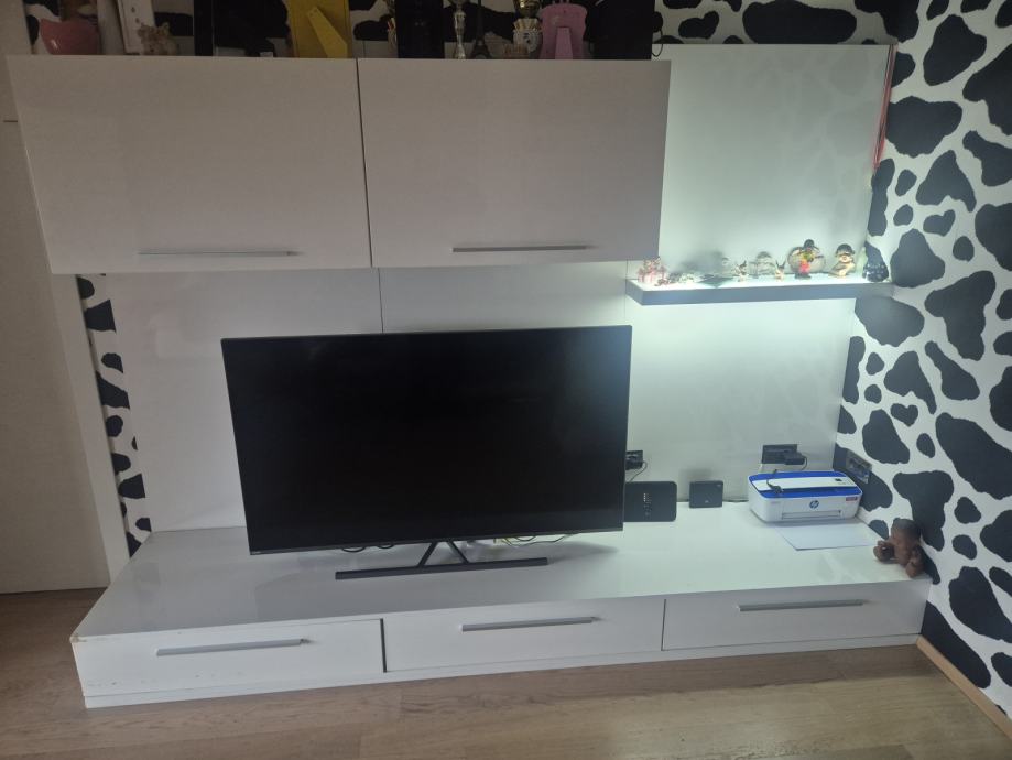 Moderni dizajn regala koji je u dobrom stanju ,a sastoji se od :gornja dva ormarica ,polica s led svjetlom ,donji element s tri ladice i tri ploce koje idu iza elementa na zid.