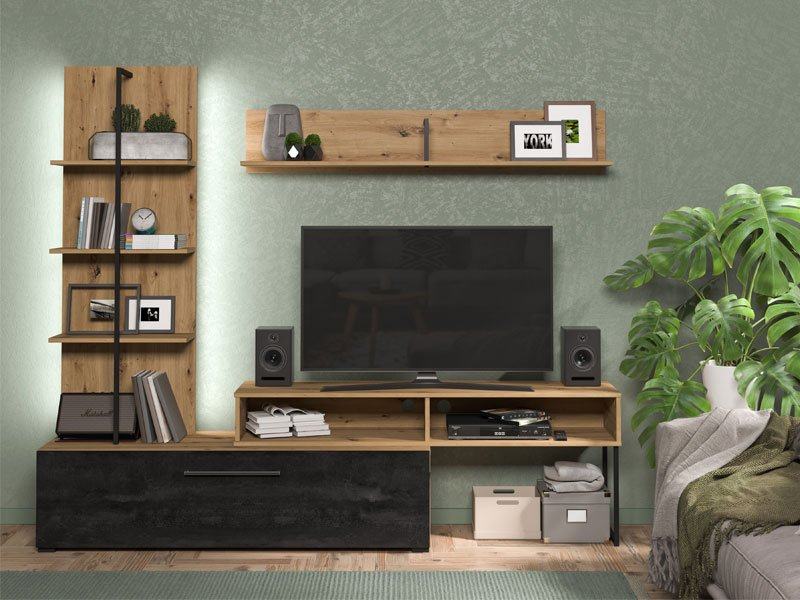 Izrađen u kombinaciji dekora artisan hrasta i carbon dekora, pruža elegantan izgled i praktično rješenje za odlaganje i organizaciju prostora.