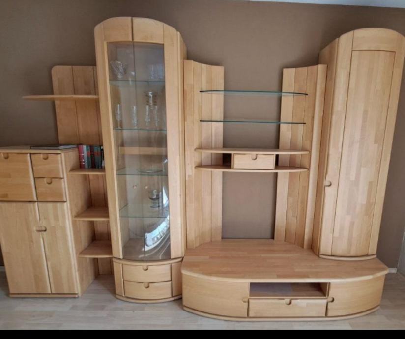 dva visoka zatvorena ormara, vitrine sa staklenim policama,otvorenih polica, TV komode s ladicom, dodatnih ladica i spremišnog prostora.