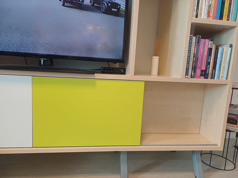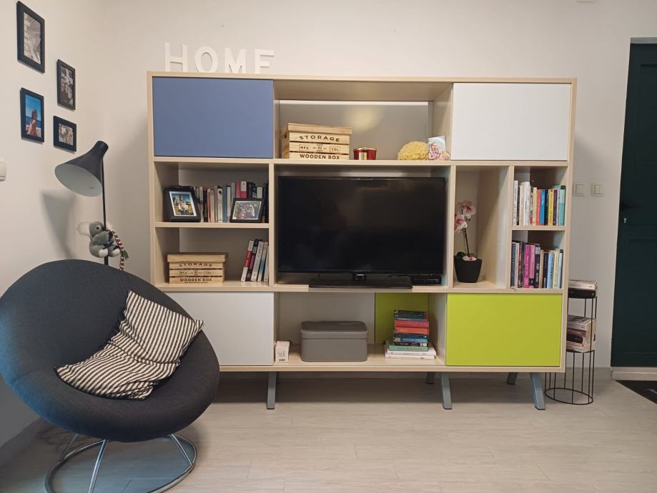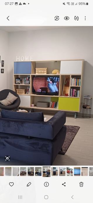 Prodajem DVOSTRANI regal za dnevni botavak idealan za open space koncept. Rađen po mjeri od medijapana. Dimenzije: širina 220 cm, visina ukupna 196 cm (nogice 21 cm), dubina 45 cm. Uz regal poklanjam podesivu podnu lampu