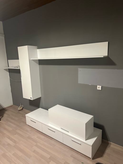 Prodajem regal u bijeloj boji, koji se sastoji od donje TV komode s tri ladice, bočnog visećeg ormarića te dugačke viseće police. Komplet je modernog, minimalističkog dizajna i dobro se uklapa u svaki dnevni boravak. Donja komoda nudi dovoljno prostora za TV uređaj i ostale sadržaje, dok viseći elementi pružaju dodatni prostor za odlaganje i izlaganje predmeta.