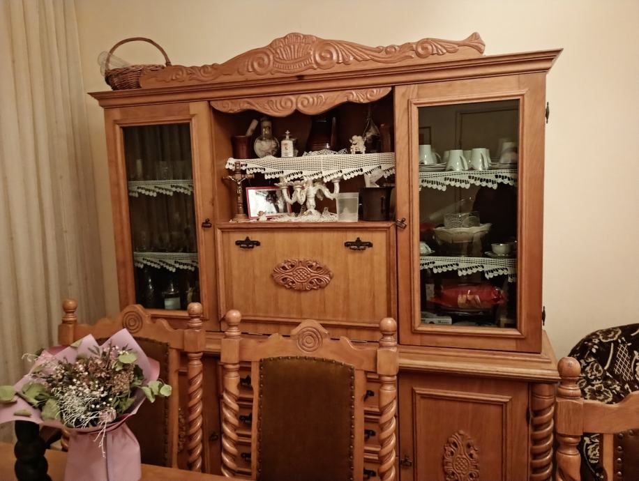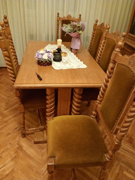 Očuvani regal, puno drvo s pripadajućim stolom i Sest stolica.