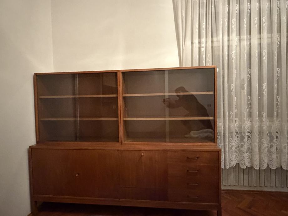 Masivna retro komoda s gornjom staklenom vitrinom. Komad je autentičan primjerak dizajna sredine prošlog stoljeća, prepoznatljiv po čistim linijama, toploj boji drva i funkcionalnosti.