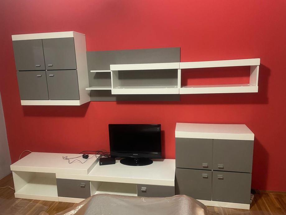 Prodajem modernu vetrinu u sivo-bijeloj boji visokog sjaja, staru 2 godine, sa svim elementima sa fotografije.