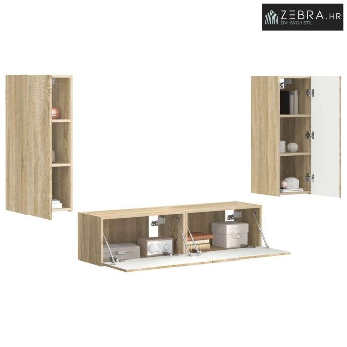 Funkcija / Dizajn: Zidna montaža štedi prostor i donosi suvremeni izgled. Funkcionalna pohrana pomaže sakriti kablove i ostale sitnice, držeći vaš prostor urednim. Moderni dizajn osigurava da je set uz to i funkcionalan i estetski privlačan.