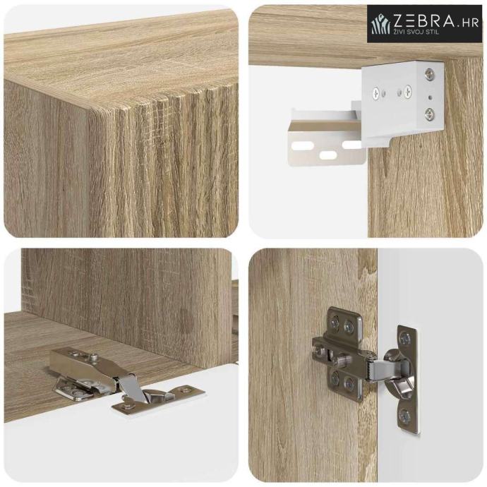 Robusno konstruirano drvo: Izrađeno od visokokvalitetnog konstruiranog drva, poznatog po svojoj snazi i otpornosti. Ovaj materijal osigurava stabilnost ormarića, čak i kada je opterećen težim predmetima. Trajnost konstruiranog drva čini ga savršenim izborom uz moderan izgled primjeren raznim dekorima.