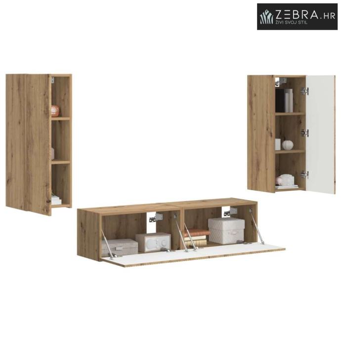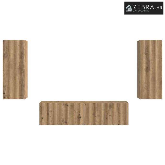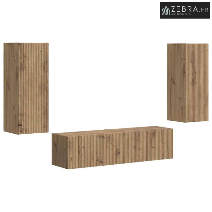 Ovaj set TV kabineta pretvara svaku dnevnu sobu u stilski i organiziran prostor. Njegov minimalistički stil savršeno se uklapa u moderne interijere. Namijenjen za TV uređaje, omogućuje izlaganje i organizaciju, drži sve potrebne stvari na svom mjestu, dok zidna montaža oslobađa prostor ispod, stvarajući osjećaj prostranosti.