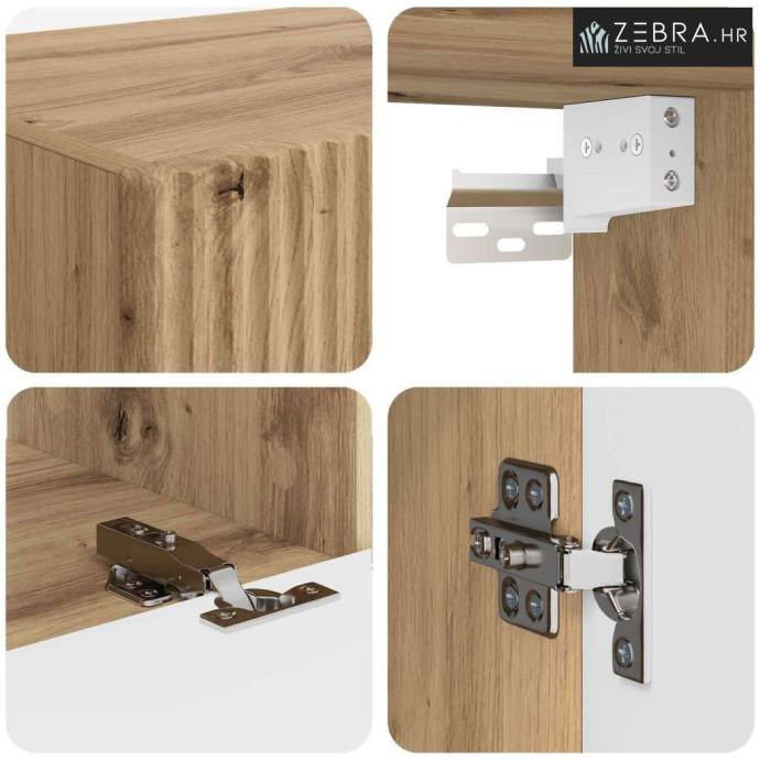 Robusno konstruirano drvo: Izrađeno od visokokvalitetnog konstruiranog drva, poznatog po svojoj snazi i otpornosti. Ovaj materijal osigurava stabilnost ormarića, čak i kada je opterećen težim predmetima. Trajnost konstruiranog drva čini ga savršenim izborom uz moderan izgled primjeren raznim dekorima.