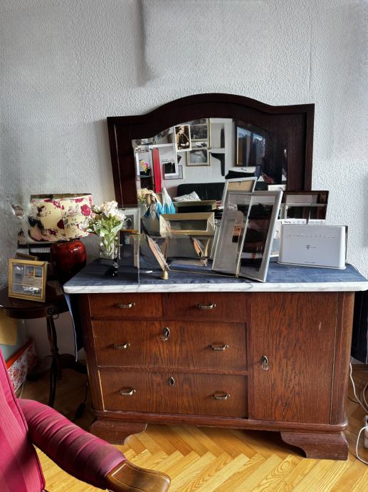 Prodaje se lijepa antikna komoda od drva sa pločom od marmora. Ogledolo nije fiskno sa komodom, ali se prodaje skupa.