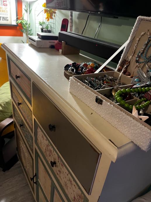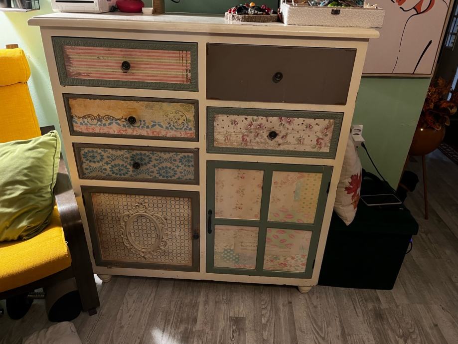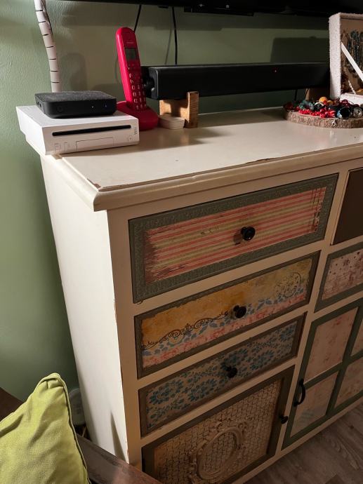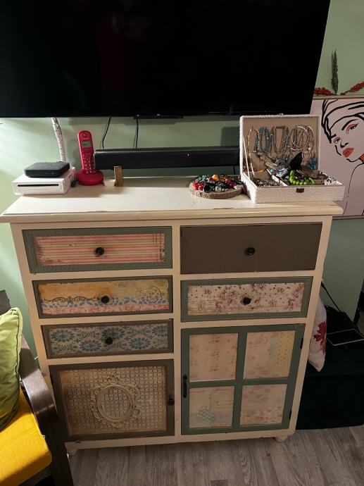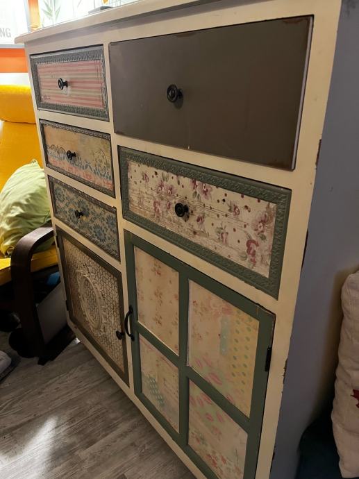 Prodajem prelijepu komodu u shabby chic stilu s raznobojnim ladicama i vratima. U vrlo dobrom stanju, idealna kao dekorativni i funkcionalni komad za dnevni boravak, spavaću sobu ili hodnik.
