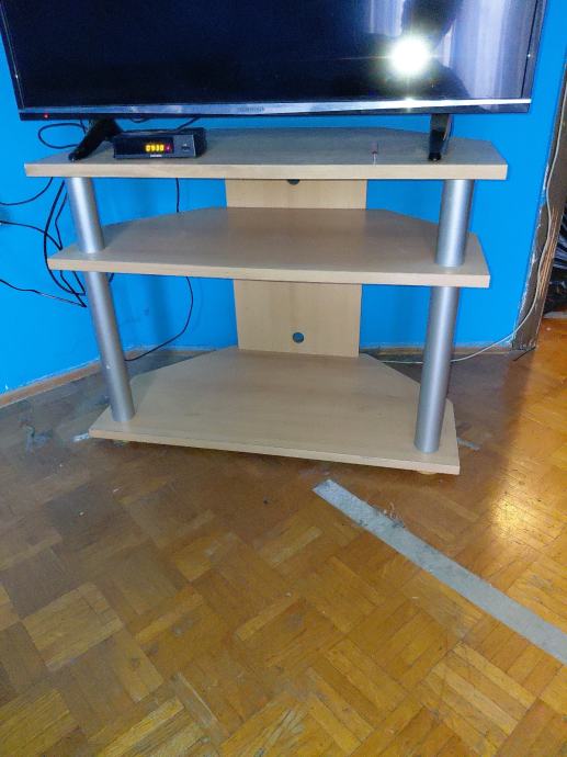 Prodajem stolić za TV s tri police i srebrnim metalnim nosačima. Izrađen je od ploče svijetle, prirodne boje drva, a police su zaobljenih rubova što mu daje uredan izgled. Prikladan je za smještaj televizora, kao i razne AV uređaje, dekodere ili konzole na preostalim policama.
