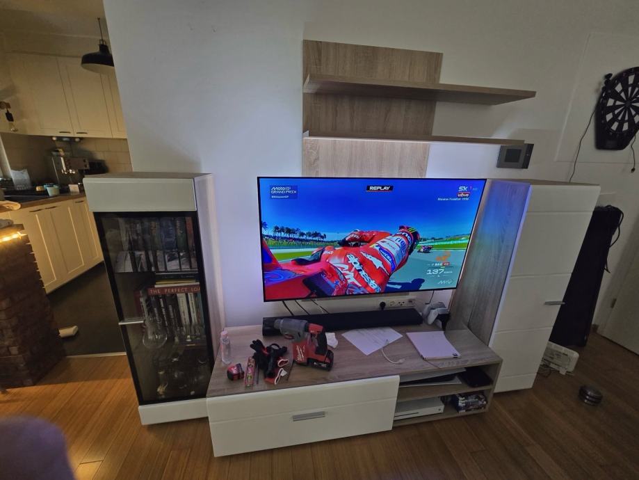U dobrom stanju, jedina vidljiva oštećenja su rupe na zidnoj polici gdje je nosac od tva bio pričvršćen i odlijepila se malo bijela fronta sa desnog elementa. Moze se zalijepiti montažnim ljepilom ili necim sličnim.