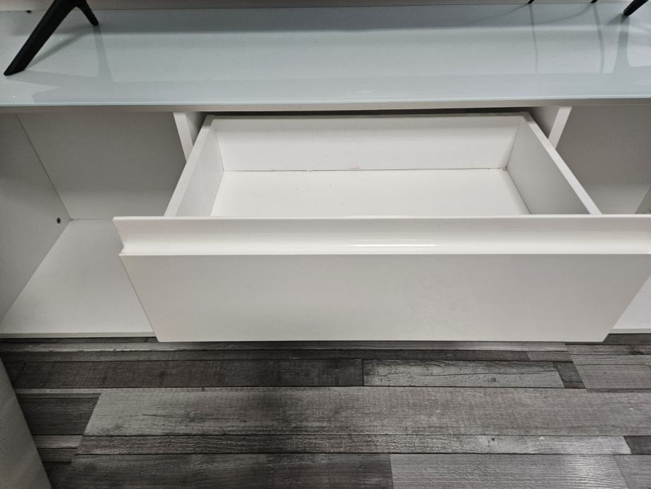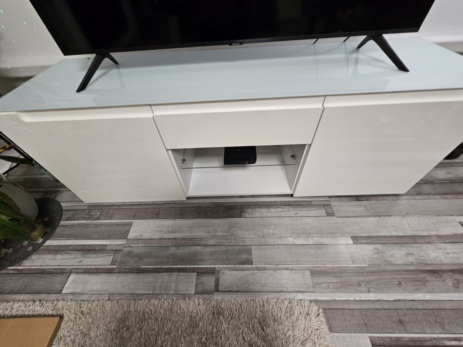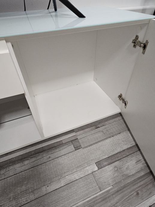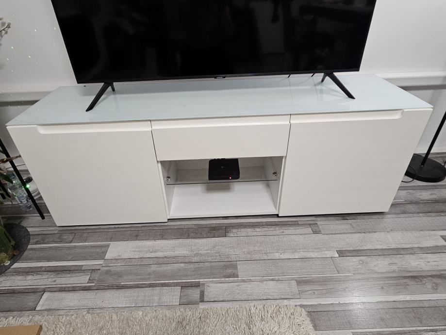 Prodajem kotištenu tv komodu. Očuvana, gornji pokrov mutno, bijelo staklo. Sastoji se od 2 dijela s vratima i srednjeg dijela od 1 ladice i 1 staklene police. U ladici je malo oštećenje. Nema ručke. Dimenzije komode izvana VxŠxD 52x40x150 ( 2 cm visine su nogice na kojima je komoda). Šitina ladice je 47cm, prostora za odlagsnje 47,5cm -širine mjerene bez stanica. Prostor između podnožja i staklene police, te police i ladice je razmaka 15,5 cm.