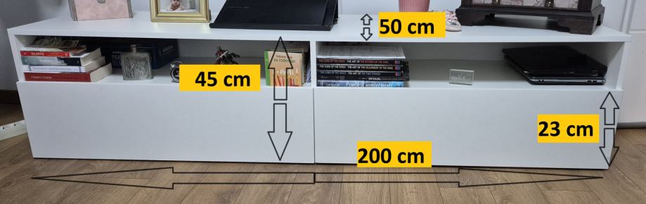 Prodaje se korištena, ali očuvana tv komoda dimenzija Š 200cm / D 50cm / V 45cm sa zatvorenim djelom visine 23cm (dimenzije ucrtane na fotografiji). Isključivo osobno preuzimanje u Puli.