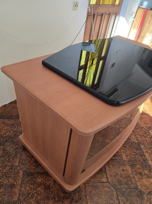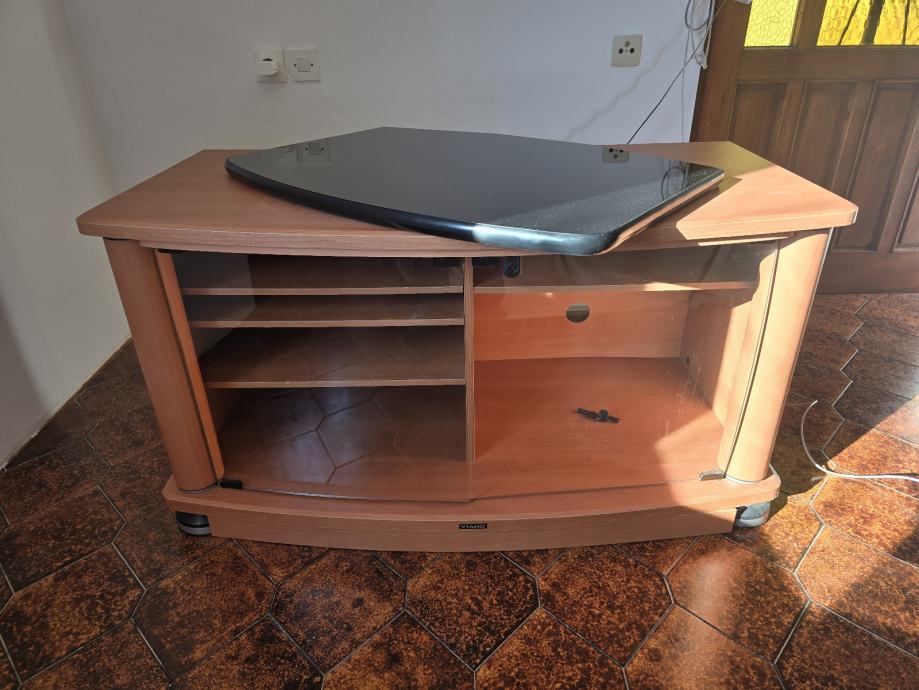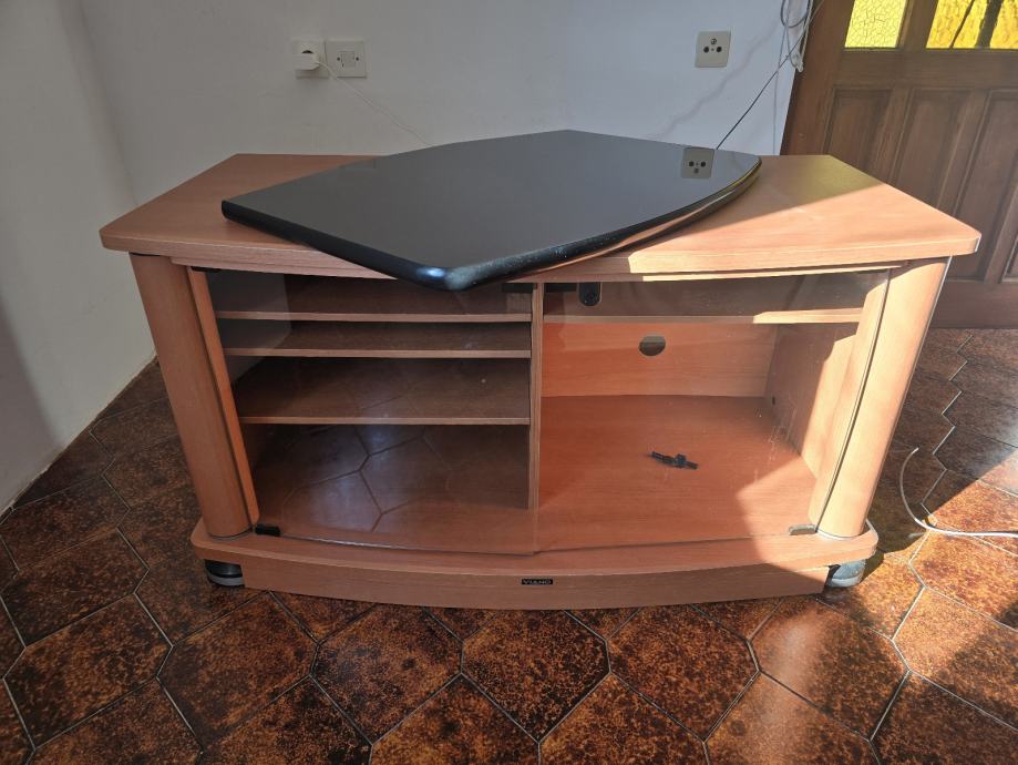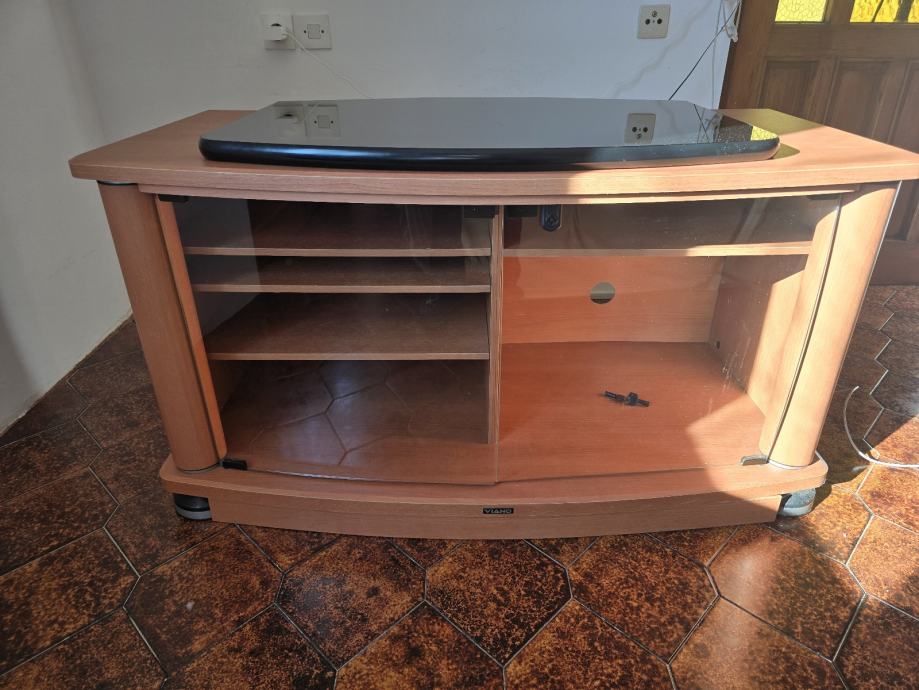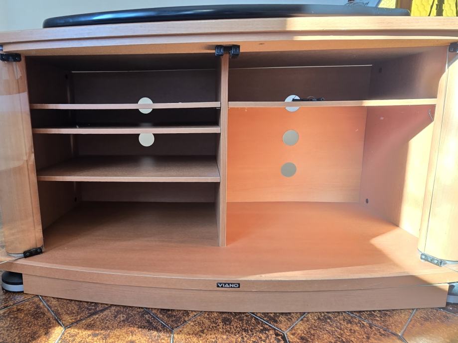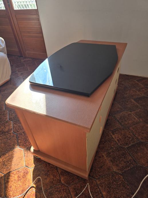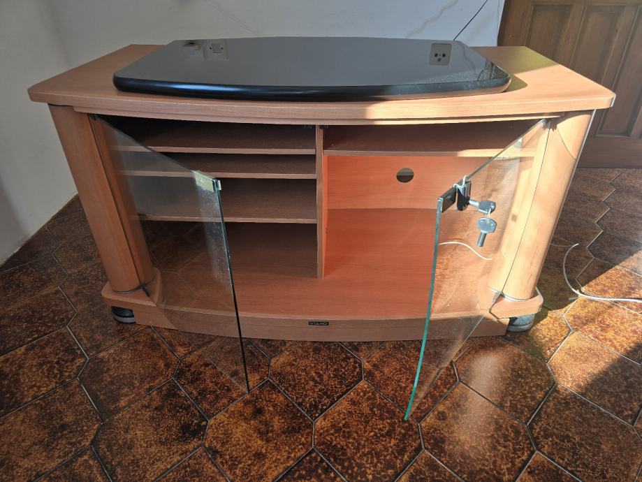 Komoda boje trešnje u odličnom stanju, širine 120 cm, na kotačima s okretnim postoljem za TV. Staklene, zatamnjene vratnice s mogućnošću zaključavanja sadržaja na policama namijenjenim za svu ostalu, kućnu elektronsku i Hi-fi opremu.