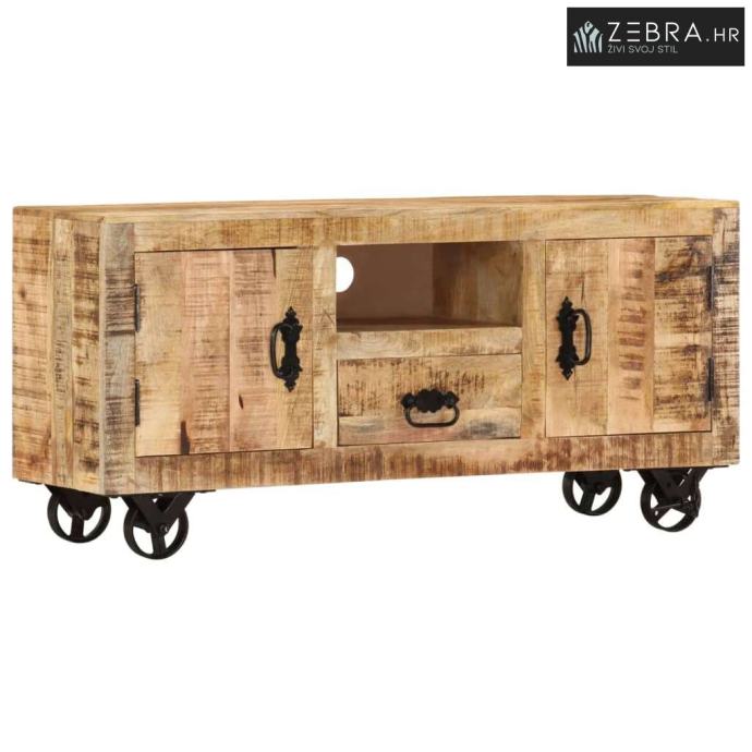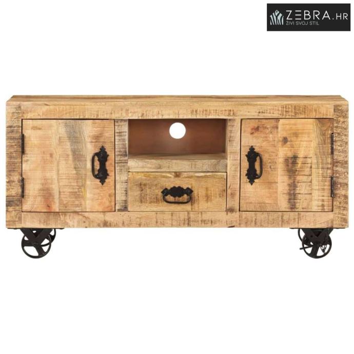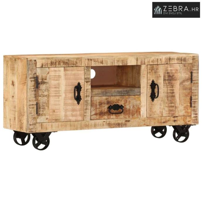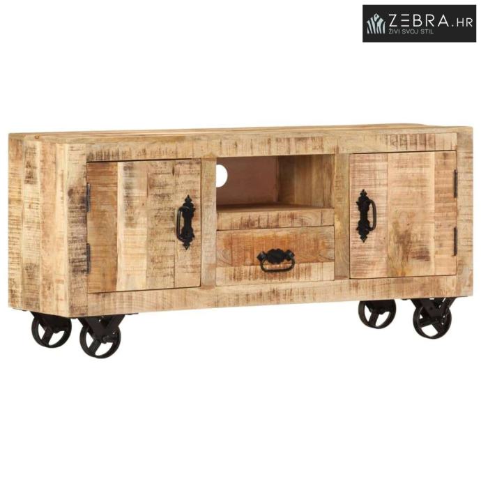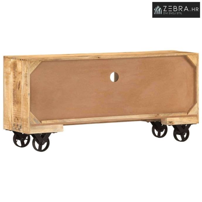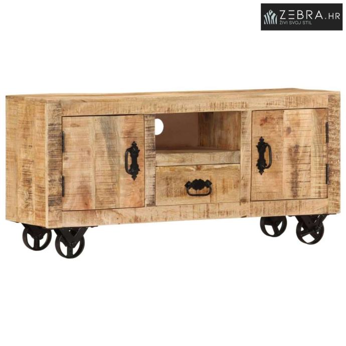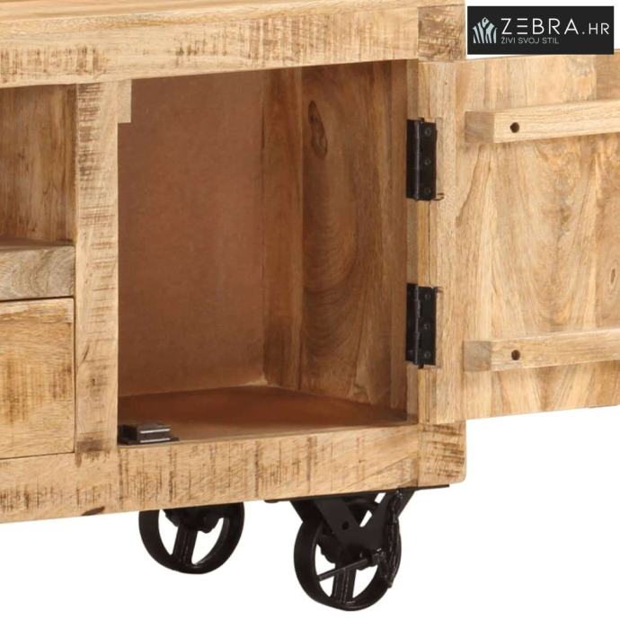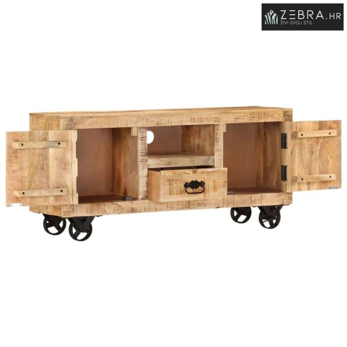 TV ormarić je ručno izrađen od neobrađenog, čvrstog drva manga koje je stabilno, izdržljivo i prekrasno. Vrhunska izrada pridonosi njegovom spektakularnom retro stilu a svaki korak u procesu izrade je izveden s najvećom pažnjom, bilo da se radi o poliranju ili lakiranju. Kvaliteta izrade i prelijepa tekstura drva čine svaki komad namještaja jedinstvenim i pomalo drugačijim od sljedećeg. Uz to 2 pretinca, 1 ladica i 1 polica pružaju puno prostora za odlaganje multimedijskih uređaja, medijskih prijenosnika i drugih predmeta koje biste željeli izložiti ili imati na dohvat ruke. TV ormarić je opremljen s 4 željezna kotačića koji ga čine jednostavnim za pomicanje i upotpunjuju industrijski dojam.