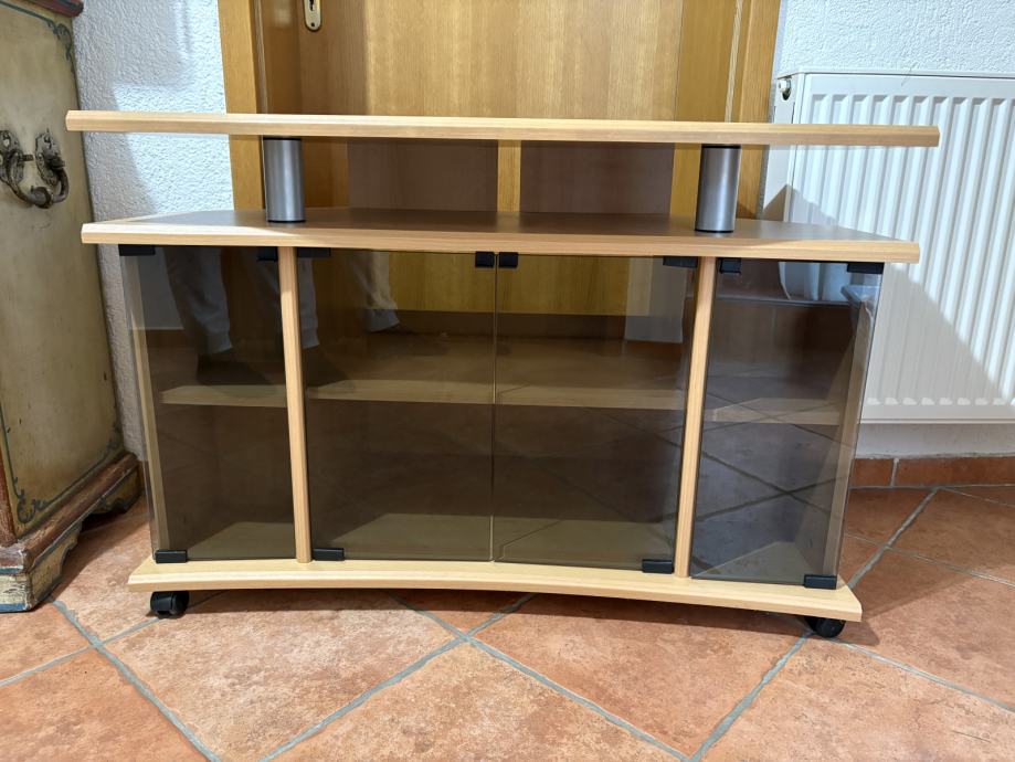 Ormarić ima 4 mala staklena vrata, idealan za TV, dodatne uređaje ili spremanje opreme.
