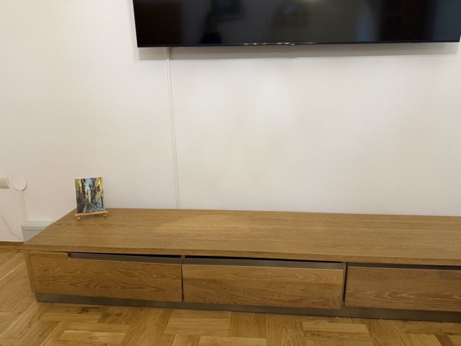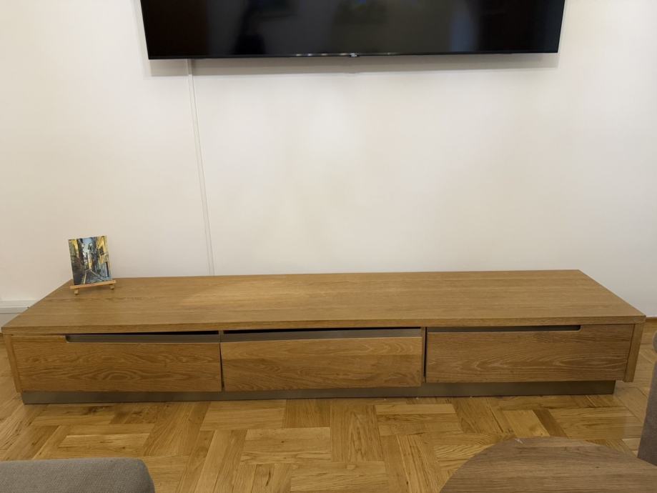 Prodajem TV ormarić od punog drveta, hrast masiv. Riječ je o niskom, izduženom modelu s tri ladice koje nude dovoljno prostora za odlaganje raznih stvari. Ormarić je izrazito očuvan.