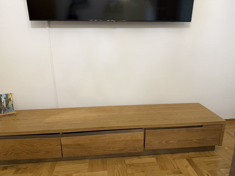 Prodajem TV ormarić od punog drveta, hrast masiv. Riječ je o niskom, izduženom modelu s tri ladice koje nude dovoljno prostora za odlaganje raznih stvari. Ormarić je izrazito očuvan.