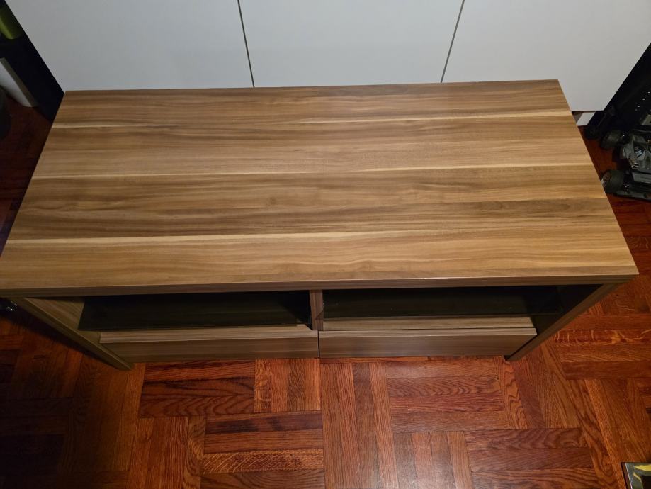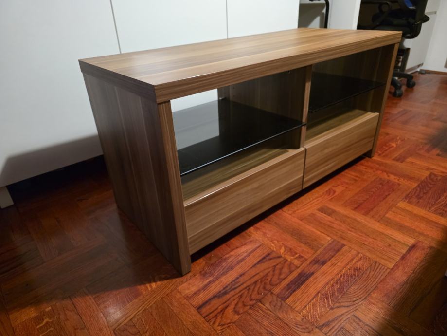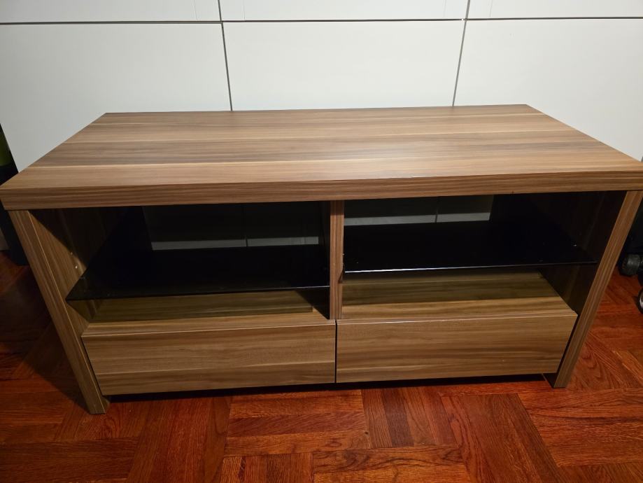 Prodajem TV regal u drvo dekoru oraha, dimenzija 109x48x54 cm. Regal ima dva otvorena prostora u gornjem dijelu, odvojena staklenom policom, idealna za smještaj TV prijamnika ili audio opreme, te dvije ladice u donjem dijelu za dodatnu pohranu. Nema nikakvih oštećenja, kao novo.