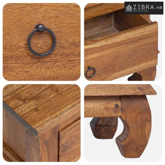 Materijali: Ova TV jedinica je napravljena od čvrste tikovine, osiguravajući dugotrajnost i otpornost. Prirodni uzorak i boja tikovine daju unikatan izgled, koji ga izdvaja od drugih jedinica. Ova kvaliteta pomaže da stalak ostane čvrst i stabilan i zadrži svoju ljepotu kroz godine kao osnovni deo u tvom dnevnom boravku. Uključene komponente: Stalak dolazi s čvrstim okvirom i ladicama od tikovine sa tradicionalnim ručkama, kao i elegantnim metalnim ručkama. Vintage izgled ladica sa svojim otvorenim dizajnom donosi praktičnost za pohranu uz dašak antike, uvećavajući cjelokupno iskustvo. Značajke/dizajn funkcije: Ručno rađen, svaka jedinica ima svoj prirodni uzorak drveta, što dodaje posebnu ljepotu. Kompaktna veličina je optimizirana za gradske prostore, omogućuje strojno učinkovitost bez pametnog preopterećenja. Preporučena uporaba: Ova TV jedinica je dizajnirana za dnevne boravke i čvrsto drži tv dok nudi dovoljno mjesta za pohranu svih dodataka za zabavu poput daljinskih upravljača, DVD-a i konzola za igranje. Vintage estetika se savršeno uklapa u klasične ili rustikalne enterijere. Njega i održavanje: Da bi se očuvala fina završna obrada, izbjegavajte abrazive prilikom čišćenja. Redovito brišite suhom krpom kako bi izgledao sjajno i duže trajao – omogućiće ti da uživaš u ovom stolu kao cijenjenom nasljeđu. Pravilno održavanje će osigurati da tikovina ostane sjajna i bez oštećenja i uz svakodnevno korištenje. Boja: Smeđa