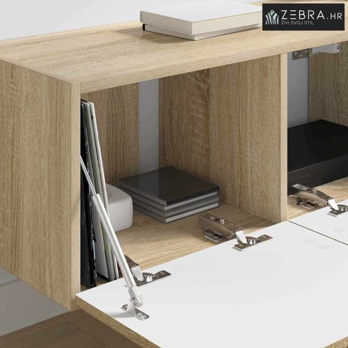 Zidne police: Ova kabineta ima zidne police koje štede podni prostor i daju moderan izgled. Savršena je za gradske stanove ili male dnevne boravke gdje je važno iskoristiti prostor.