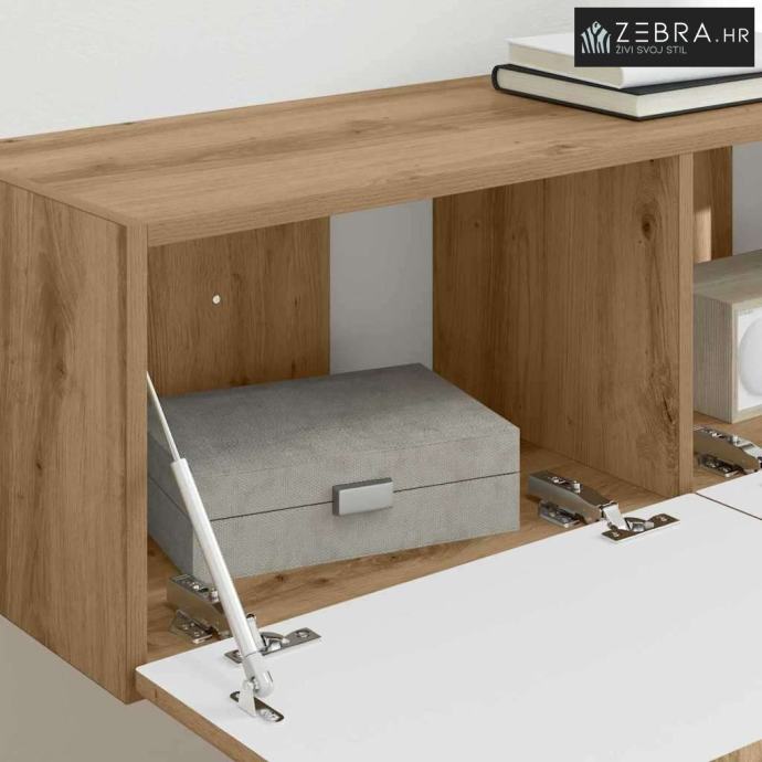 Zidne police: Ova kabineta ima zidne police koje štede podni prostor i daju moderan izgled. Savršena je za gradske stanove ili male dnevne boravke gdje je važno iskoristiti prostor.