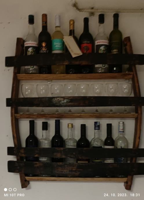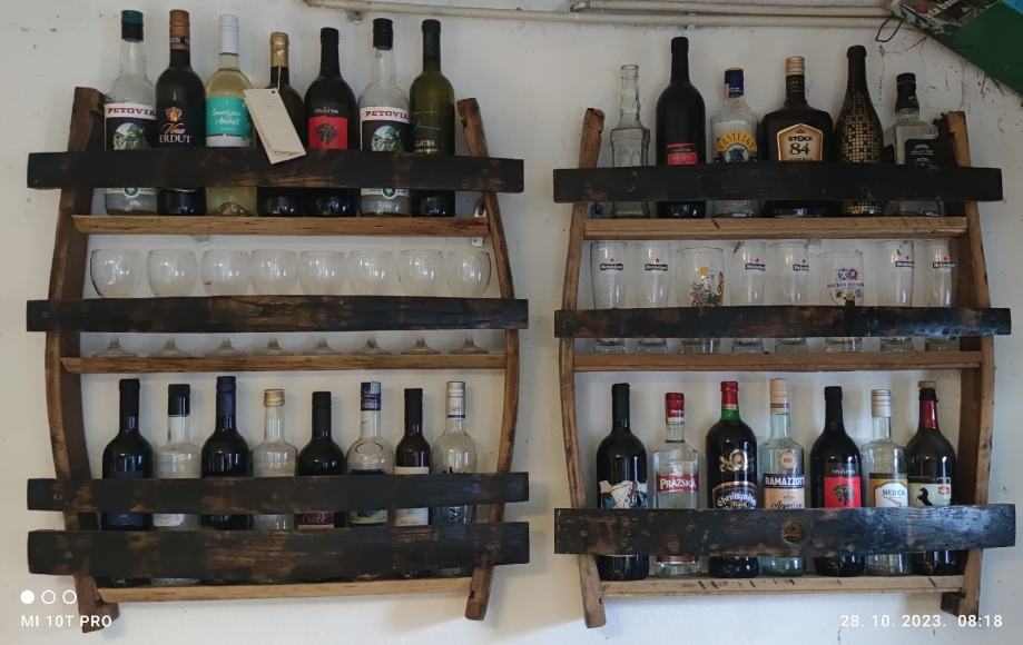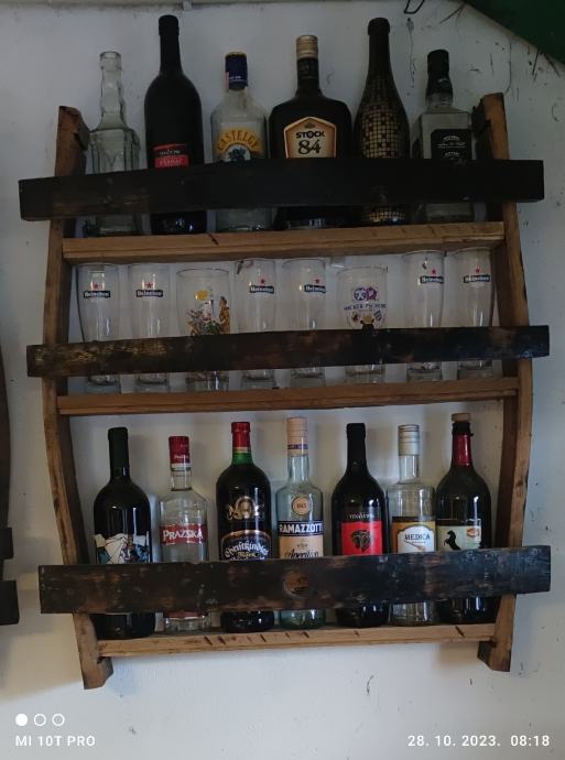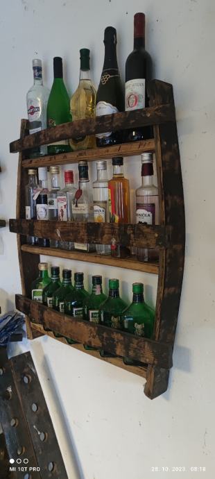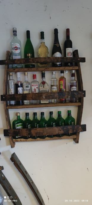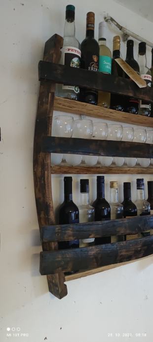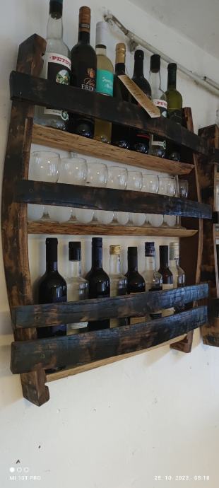Zidne police od drvenih bačvi za boce/ flaše/ butelje i čaše