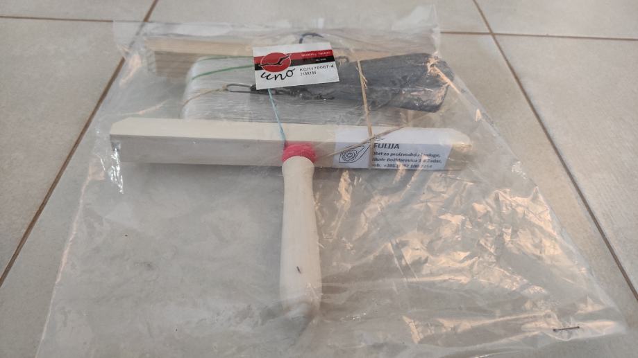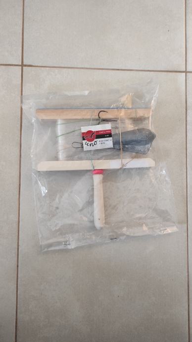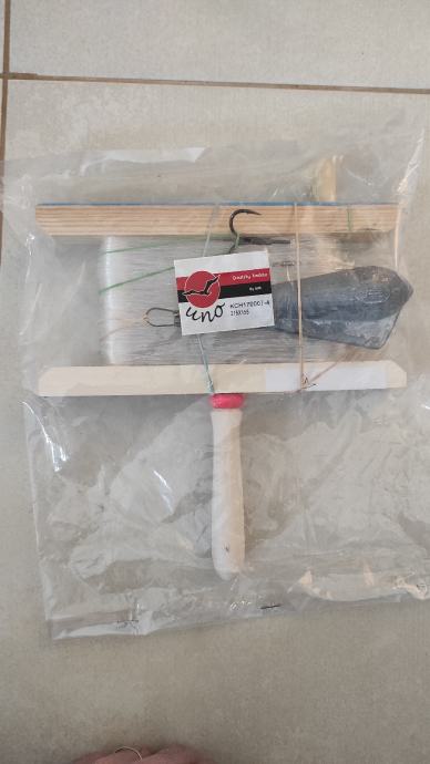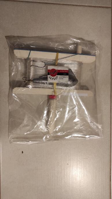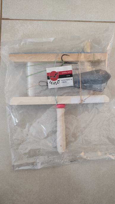 Sastoji se od drvenog motovila, osnove najlon 0.90mm 100m, predvez 0.70mm 15m sa fiksnom udicom i jednom kliznom udicom za ješkanje žive ješke kao što je lignja. Olovo čuvar 500g koji se kači na trokraki zogulin velike izdržljivosti. Između udica i trokrakog zogulina nalazi se još jedan manji zogulin koji može izdržati 80kg težine. Isporuka odmah ili po narudžbi.