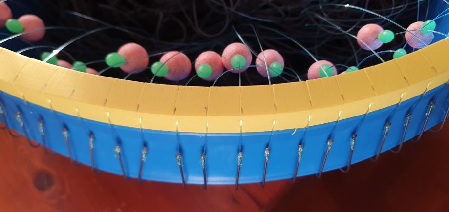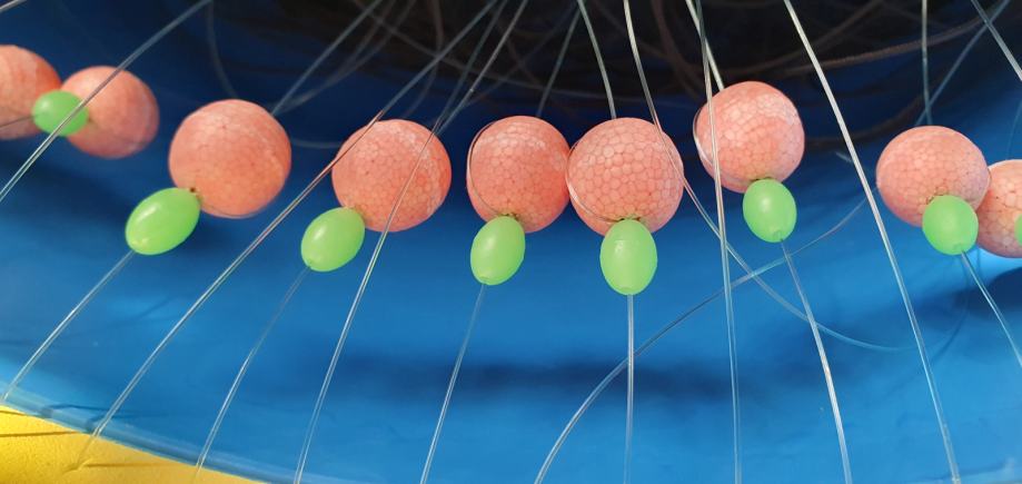 Parangal za lov oslića, pišmolja, lastavica, raža, pasa, sa FLUORESCENTNIM PERLICAMA za poboljšanu lovnost. 100 udica, Mustad inox br.10 u velikoj grčkoj kofi sa žutim pjenastim rubom. Tijelo parangala PES konop 1.50mm, prame debljine 0,6mm duljine 1m. Razmak između prama 4m. Svaka druga udica ima šuger, fluorescentnu perlicu i olovo da ješka lebdi iznad dna. Novo i nekorišteno. Ukupna duljina parangala 400m.