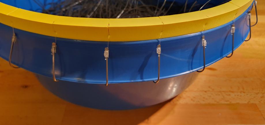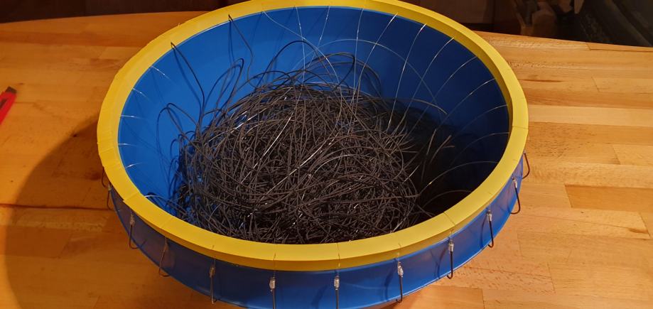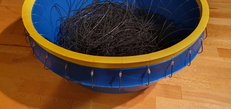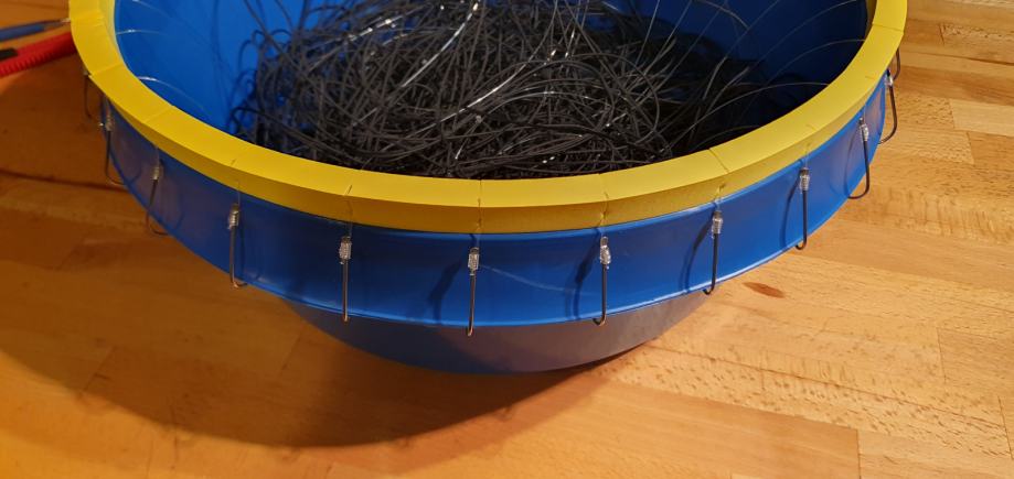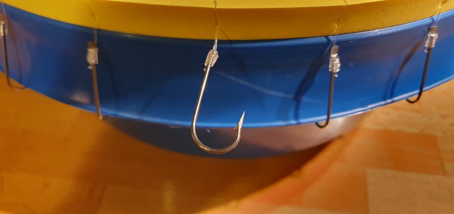 Parangal za lov zubaca 25 udica. Tijelo - konop 1,5mm. Prame debljine 0.80mm duljine 1m. Prame su vezane na tijelo parangala na razmaku od 5m. Udice su Mustad inox br.8, 25 kom. Plastična kanta većeg promjera sa gumenim rubom za prihvat udica. Novo, nikad korišteno.