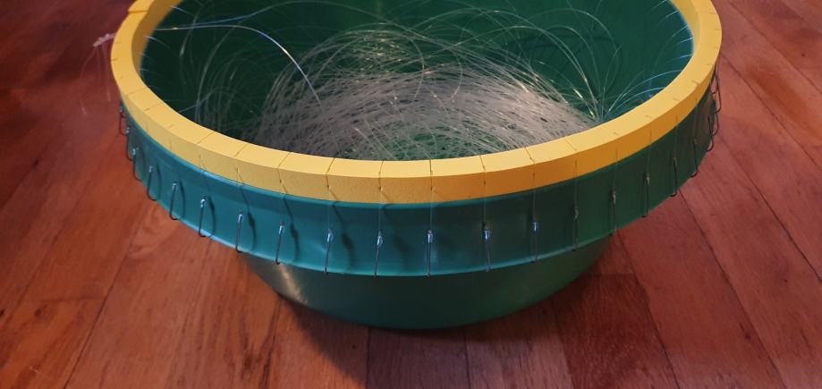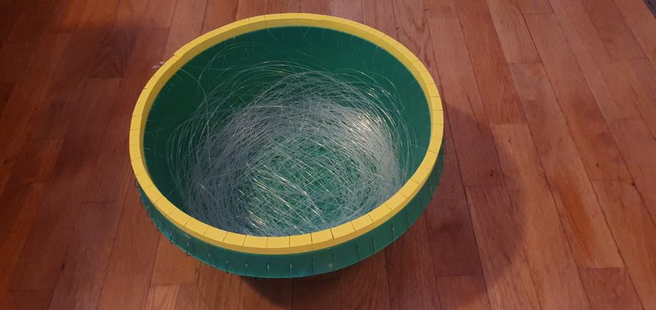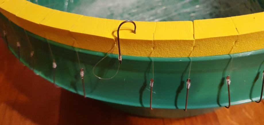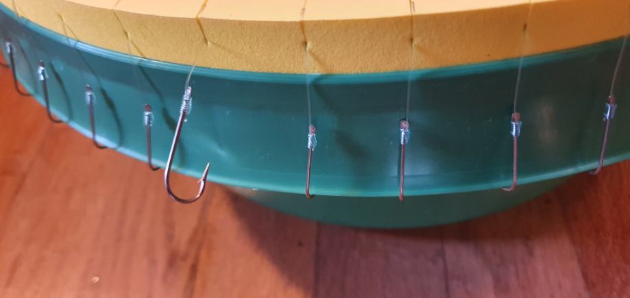 Parangal je nov, nikad korišten u grčkoj kofi sa pjenastim žutim rubom za prihvat udica. Osnova najlon monofil 0.90mm, prame dužine 1m od monofila 0.45mm. Razmak između udica 4m ili po želji. Udice parangalke Mustad inox br. 12. Cijena 55€.