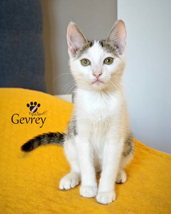 Gevrey je rođen oko 20.3.2024., tretiran je od parazita, cijepljen i docijepljen na zarazne bolesti i naučen na život u stanu. Neplašljiv je, društven i umiljat. Voli se igrati, slaže se sa macama i sa psom, a s ljudima je pitom i mazan.