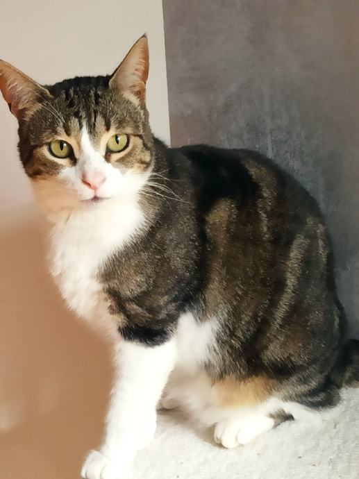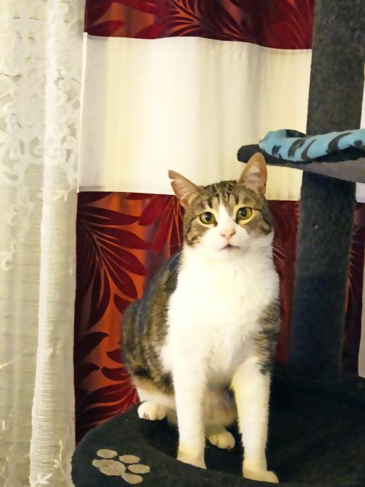 Prelijepa, slatka sivo bijela maca, pomalo plaha s ljudima ali samo ispočetka. Jako voli druge mace i igru s njima. Voli se posebno igrati mahalicama. - četiri godine stara.