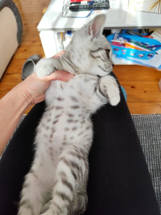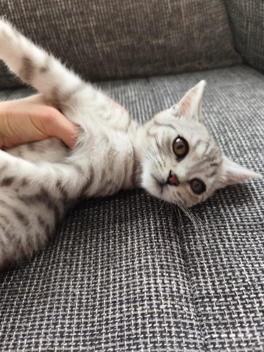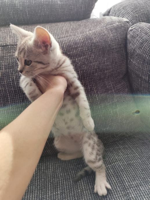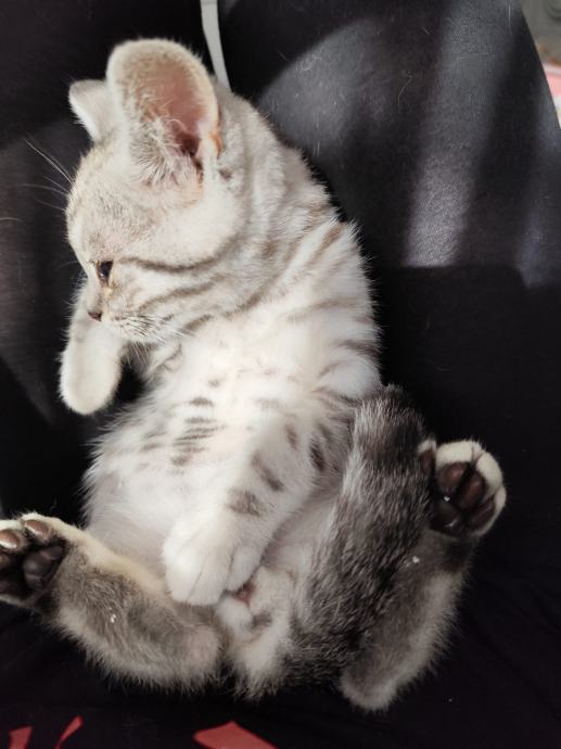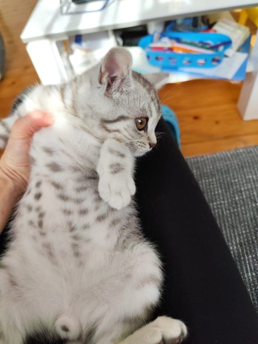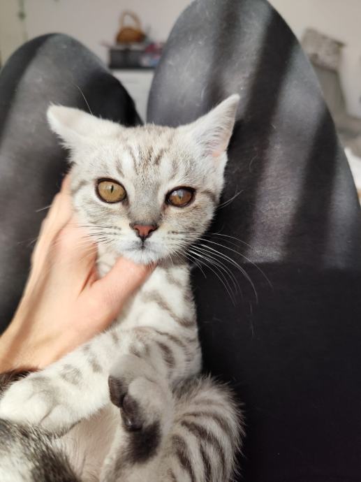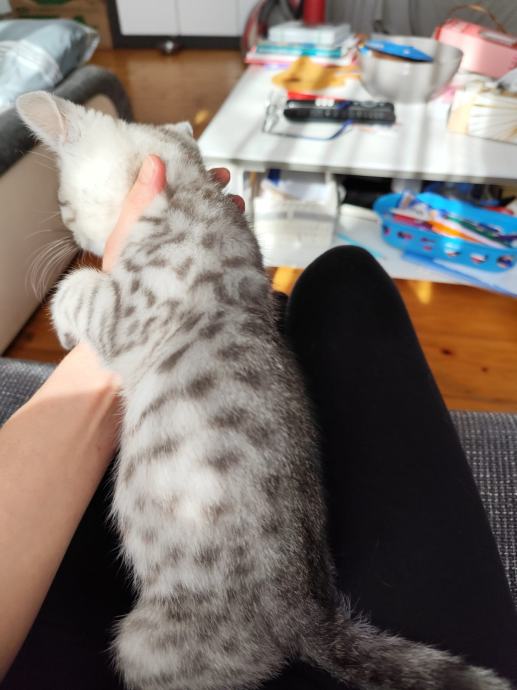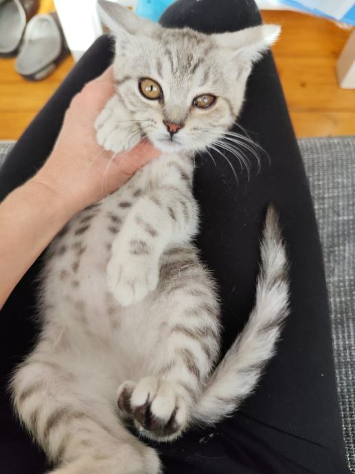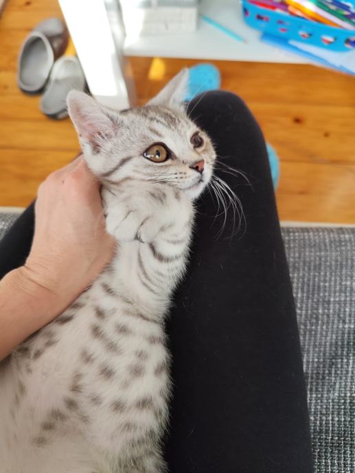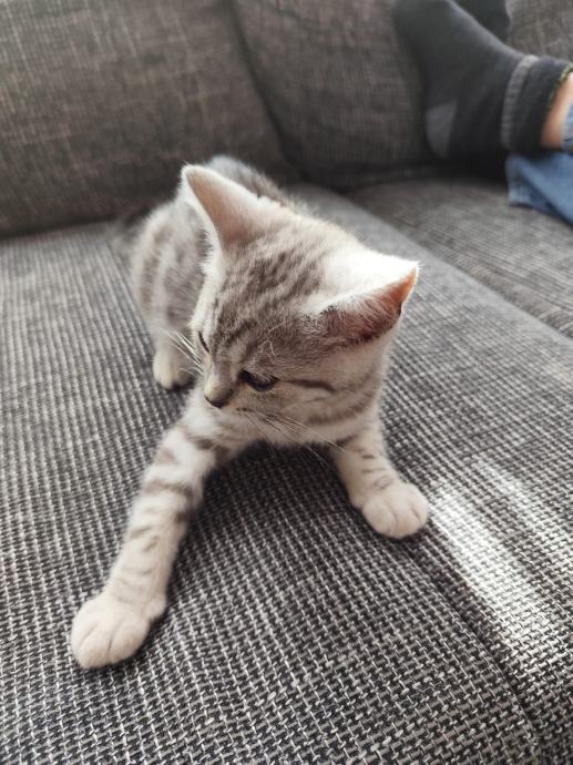 Očišćen je od unutarnjih i vanjskih nametnika i cijepljen prvom dozom cjepiva( trebao bi primiti još jednu dozu.Mačić je imao upalu oka te mu je kao posljedica ostalo malo zamučeno lijevo oko( mačić vidi na oko).