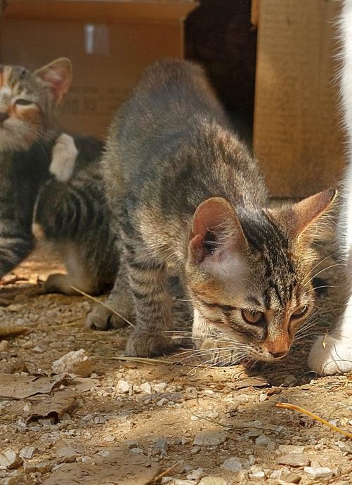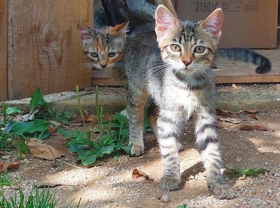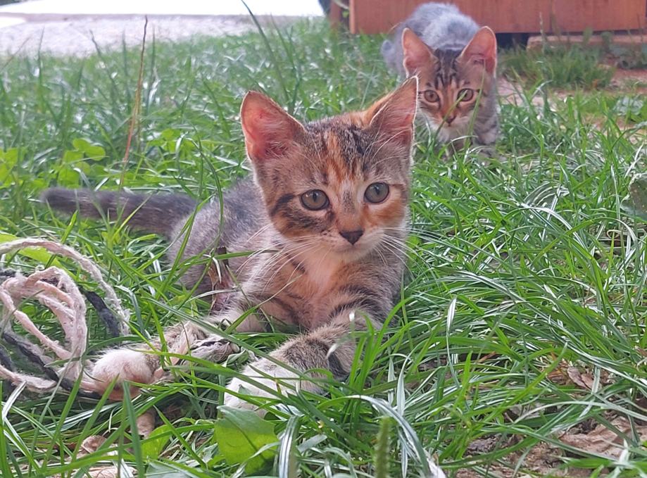 Mačići su u posljednjih mjesec dana navikli da budu zajedno. Prvi mačić šarenog krzna sa izraženim narančastim šarama po glavi je razigrana i avanturističkog karaktera. Istražuje, luta i penje se gdje stigne. Drugi mačić sivog krzna bez narančastih šara je plašljiviji. Naviknut je biti uz mamu, ali što je starija to je otvorenija. Vjerujemo da joj je samo potrebno malo topline i da će biti i od vas nerazdvojiva.