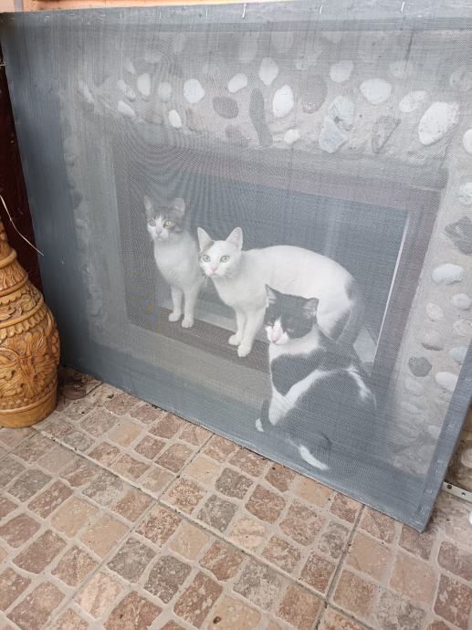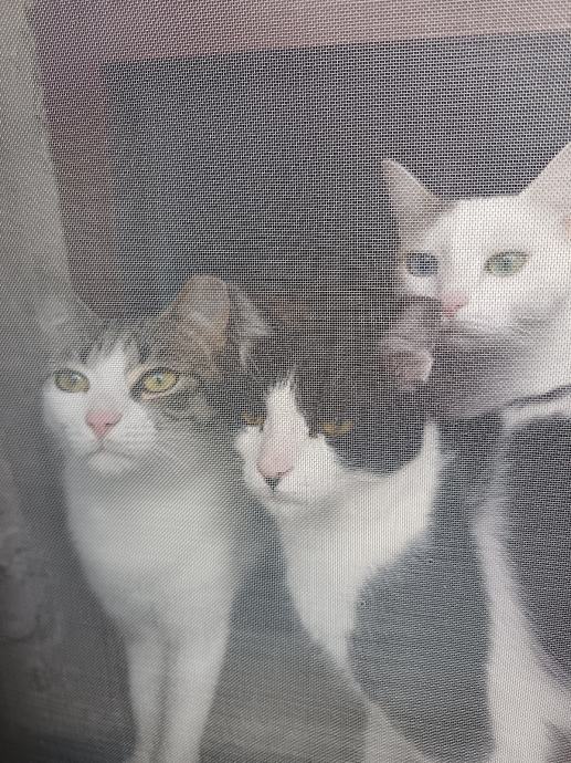 Boo crno bijela i Linda tigrasto bijela sada će imati za nekih mjesec dana 1 godinu, Fred dečkić tigrić oko 6 mjeseci, možda i 7, sterilizirani socijalizirani, idu na pijesak, nisu naučena na život izvan kuće. Udomljavam izričito u kuću bez izlazaka van, mreže obavezne ovakve kakve su na slici jer svaku drugu uredno pregrizu(mislim na komarnike koje su od platna), ovo je gusta žica koja ujedno štiti i od ulazaka komaraca i drugih buba. Slobodno možete doći se upoznati s njima a ako vam se budu dale pomaziti mi idemo kod vas da se ipak opuste dok sam i ja s njima. Bijela nije za udomljavanje, ali gura se uvijek za slikanje