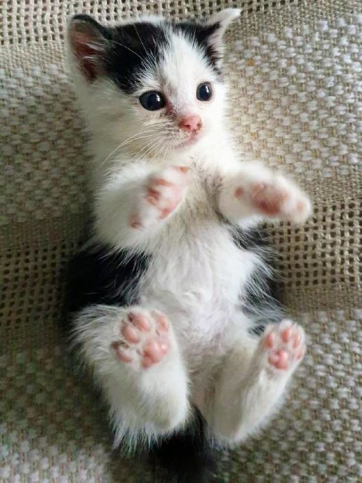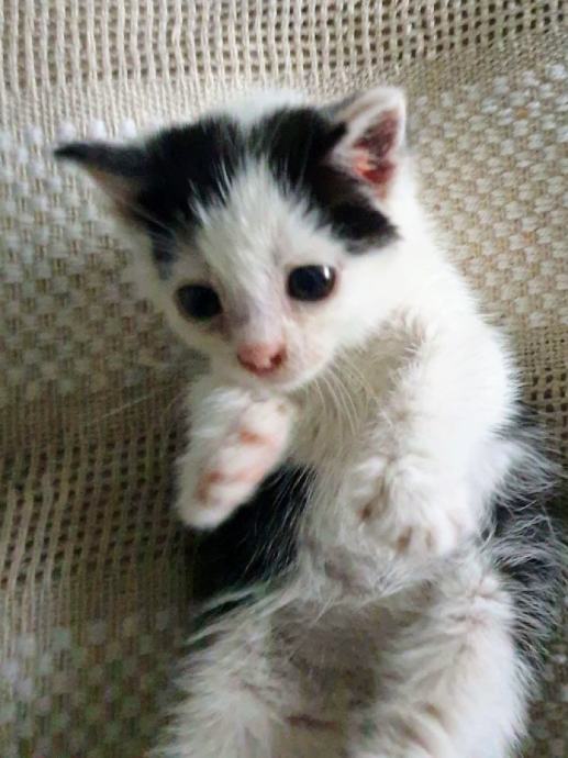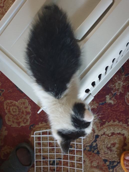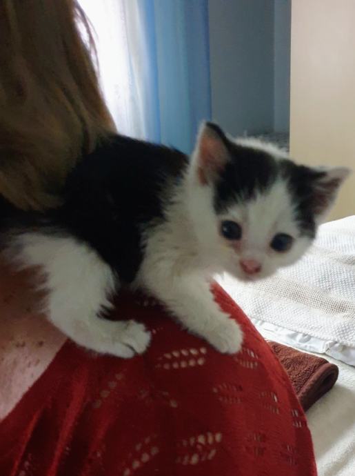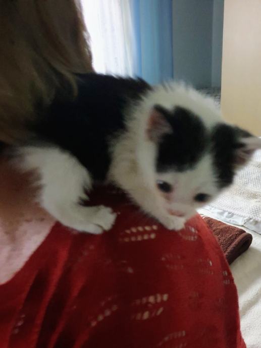 Poklanja se mali, bijelo crni mačić, očišćen od parazita, umiljat, kvalitetno hranjen, pod vet. skrbi, naučen na posip.