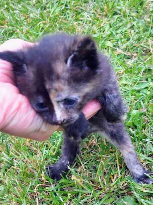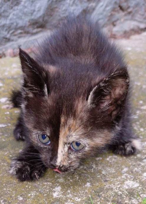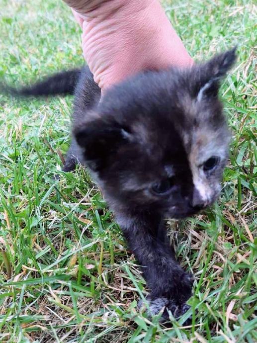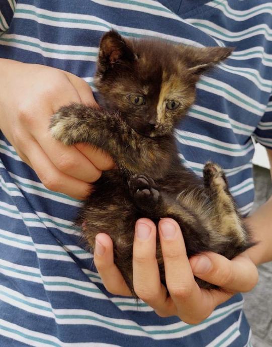 Poklanja se crno špricana maca, stara 2 mj, očišćena od parazita, umiljata, kvalitetno hranjena, naučena na posip.