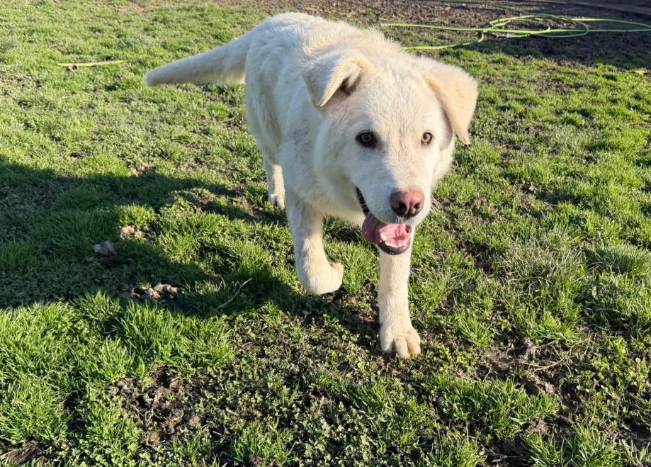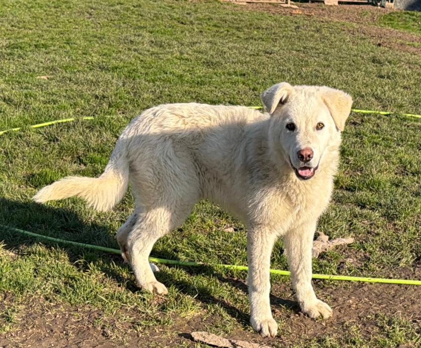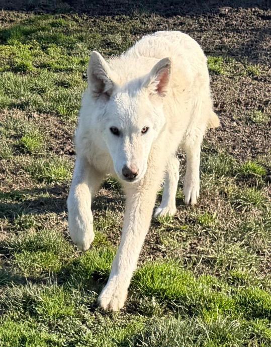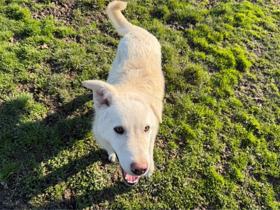 Bino je naš pravi, bijeli polarni medo. On vam je takav veseljaček, onaj tip psa koji se svemu veseli, stalno maše repom, ne zna gdje bi sa sobom od sreće. Dovoljno je da mu se samo malo obratite. A i ne morate, on je i dalje sretan. Nije ni čudo, jer on je jedna velika beba, ima oko 8-9 mjeseci. Bitće većeg rasta 30-ak kg.
