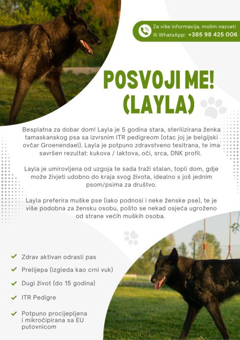 Layla je vrlo posebna djevojka, kojoj je potrebna vrlo posebna obitelj. Potpuno je zdrava i potpuno zdravstveno ispitana (kukovi, laktovi, oči, srce, DNK, itd.). Potpuno je cijepljena i dehelmintizirana, sterilizirana.