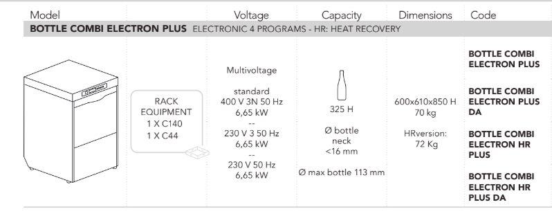 Model BOTTLE COMBI ELECTRON PLUS nudi inovativno rješenje za pranje staklenih i plastičnih boca, s mogućnošću pretvaranja u perilicu za čaše ili tanjure (ELECTRON PLUS). Idealna je za vinarije, punionice, laboratorije, craft pivovare i sve koji trebaju vrhunski rezultat pranja unutar i izvan boce.