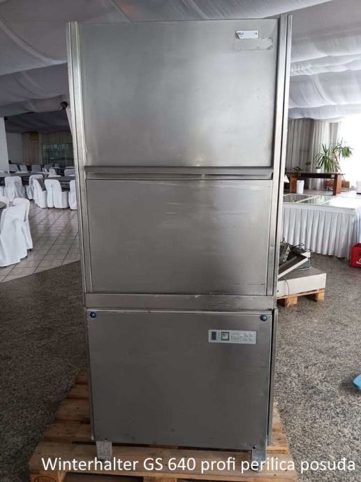 Profesionalna perilica posuđa Winterhalter GS 640, stroj namijenjen za pranje crnog posuđa, odnosno plehova, mesnica i sl. Mašina ima nekoliko programa pranja, na kraju dana se sama opere i ugasi. Oba dozatora su ugrađena u mašinu, dozator za deterdžent i dozator za sušenje za sjaj