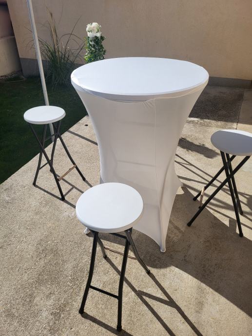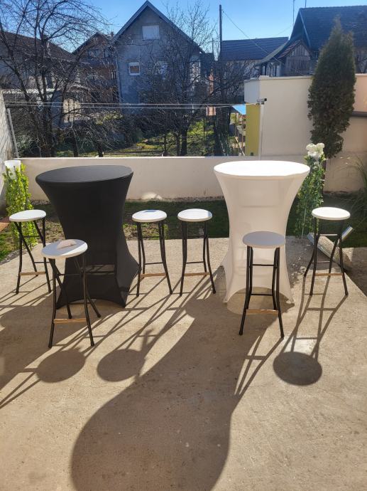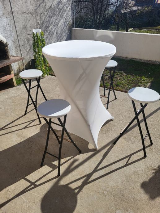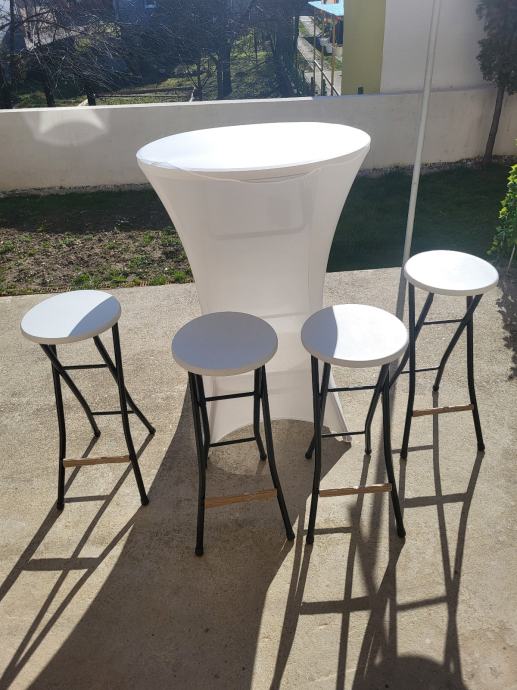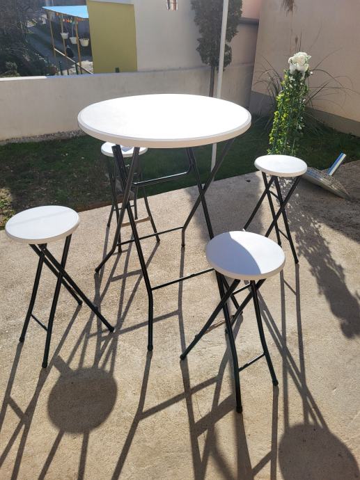 Prodajem barski stol s navlakom i četiri barske stolice.Stol i stolice su sklopive tako da nezauzimaju pono mjesta kod spremanja.