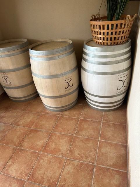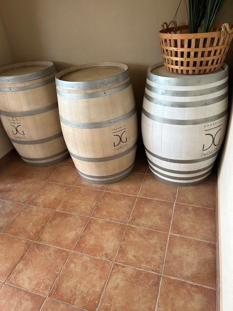Drvene bačve od 225 litara visine 95 cm. Koriste se i kao barski stolovi, ukras u konobama, vinskim lokalima ili u vrtovima. Napravljene od vrhunskog drva, svjetle i modernog izgleda. Nisu bile u upotrebi i čuvale su se u skladištu. Cijena za jedan komad 250 EUR + PDV