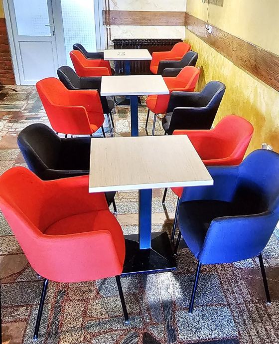 12 indoor kvalitetnih fotelja za ugostiteljstvo, 6 crvene boje, 6 tamno sive boje.