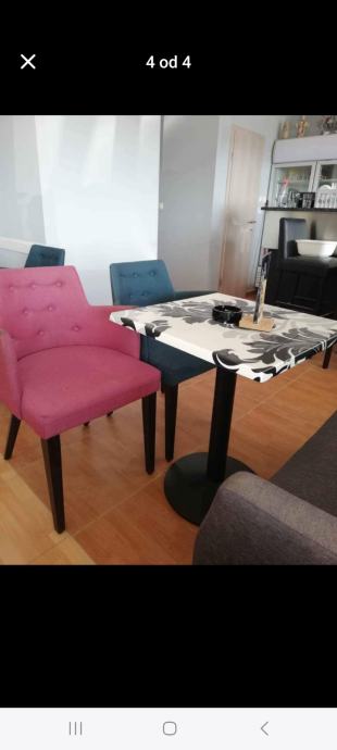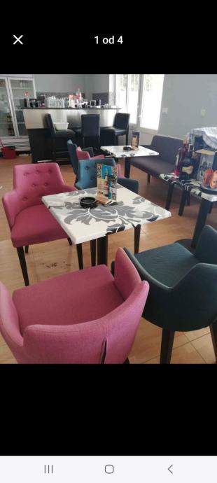 Prodajem ugostiteljske unutarnje stolice i dvosjede, koji su bili u upotrebi u ugostiteljskom objektu. Stolice su tapicirane u roze i petrolej plavoj boji, s drvenim nogama tamne boje. Dvosjedi su također tapecirani u tamnosivoj boji i solidnih su dimenzija, prikladni za postavljanje uz stolove u kafiću ili restoranu.Rozih stolica ima 9 kom , plavih 16 kom,a dvosjeda 6 kom,stolova 10 kom.Stol 70 e kom. Cijena stolica je 40 e po komadu,dvosjeda 100 e po komadu.Ako je netko zainteresiran za sve dobit ce i dodatni popust.