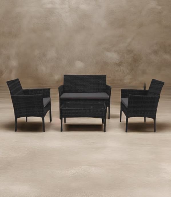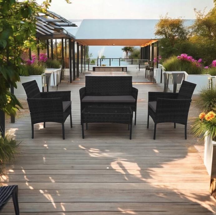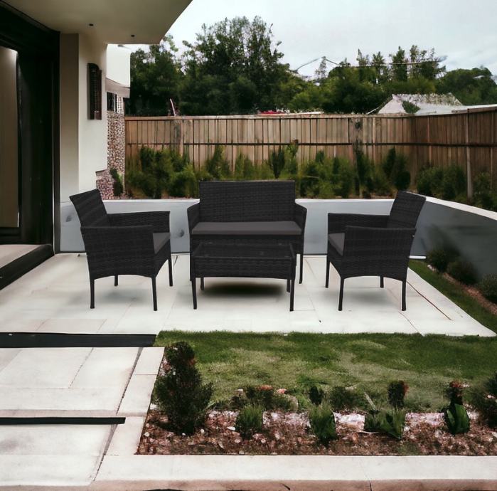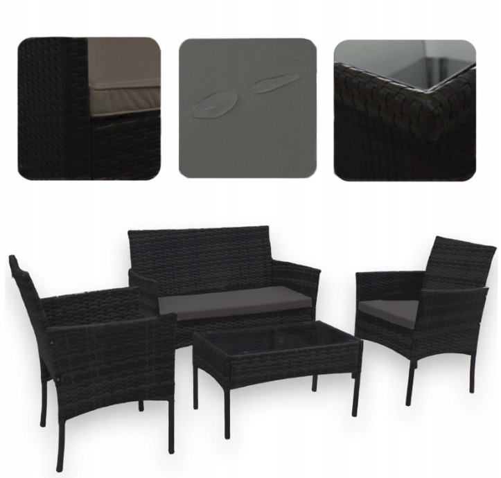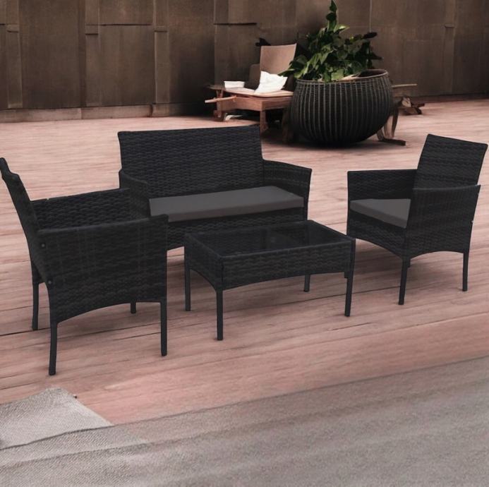Ratan vrtna garnitura s kaučem, foteljama i stolom s crnim staklom