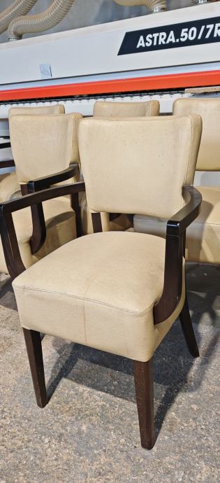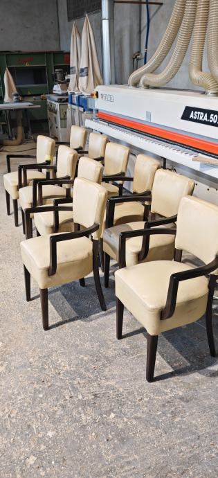 Udobne stolice, visina sjedišta 50 cm, naslon 82 cm, sjedište širine 50 cm i dubine 42 cm, drveni dio napravljen od punog drveta bukve. Masivno, čvrsto,ništa rasklimano, ništa poderano. Prodaje se u kompletu od 10 kom.